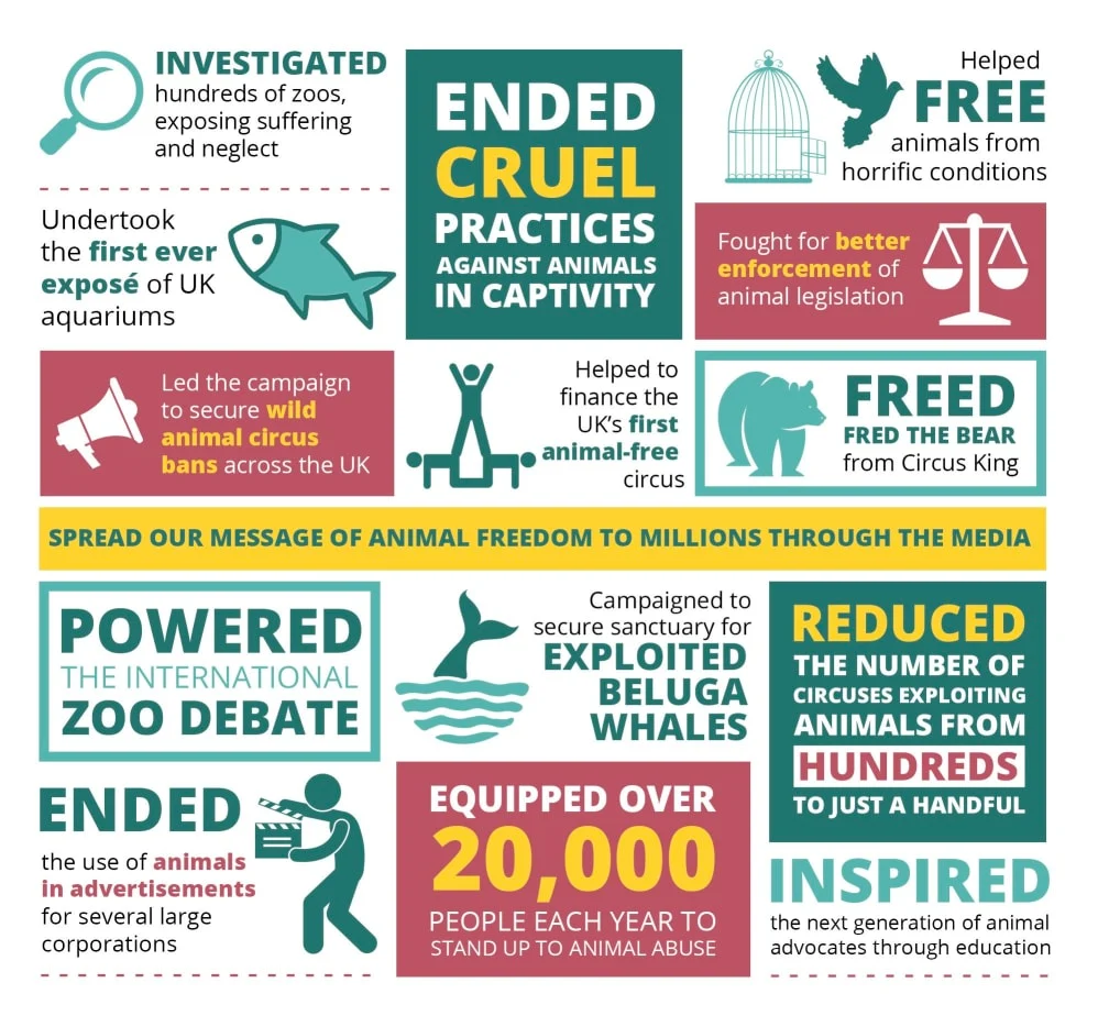 Our impact Snapshot At Captive Animals we are striving for the day when no animal is exploited or made to suffer in the name of entertainment. Thanks to our amazing supporters, we have been able to transform the lives of vulnerable captive animals. Over the years we have secured so many incredible victories, a snapshot of which we are delighted to share here. It is thanks to our wonderful supporters that we have been able to achieve such an impact. Our supporters rally together when things need to change, and petition, fight and protest. It is our supporters who enable us to undertake undercover investigations and launch hard-hitting, wide-reaching campaigns - which you can read about here. You too can be a part of this amazing work to help animals by becoming a Freedom Champion!Click here to find out more about the best way to support our work to end animal exploitation, once and for all. For more up to date information about our current campaign activities, please visit our NEWS PAGE. Manage Cookie Preferences